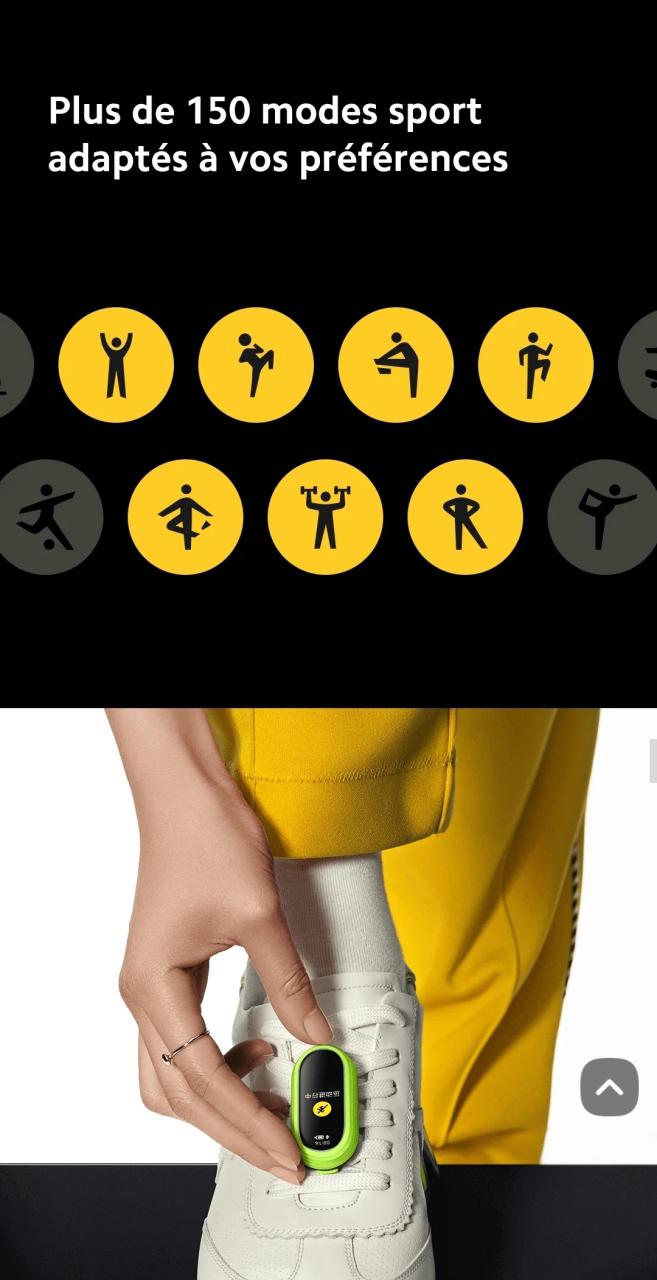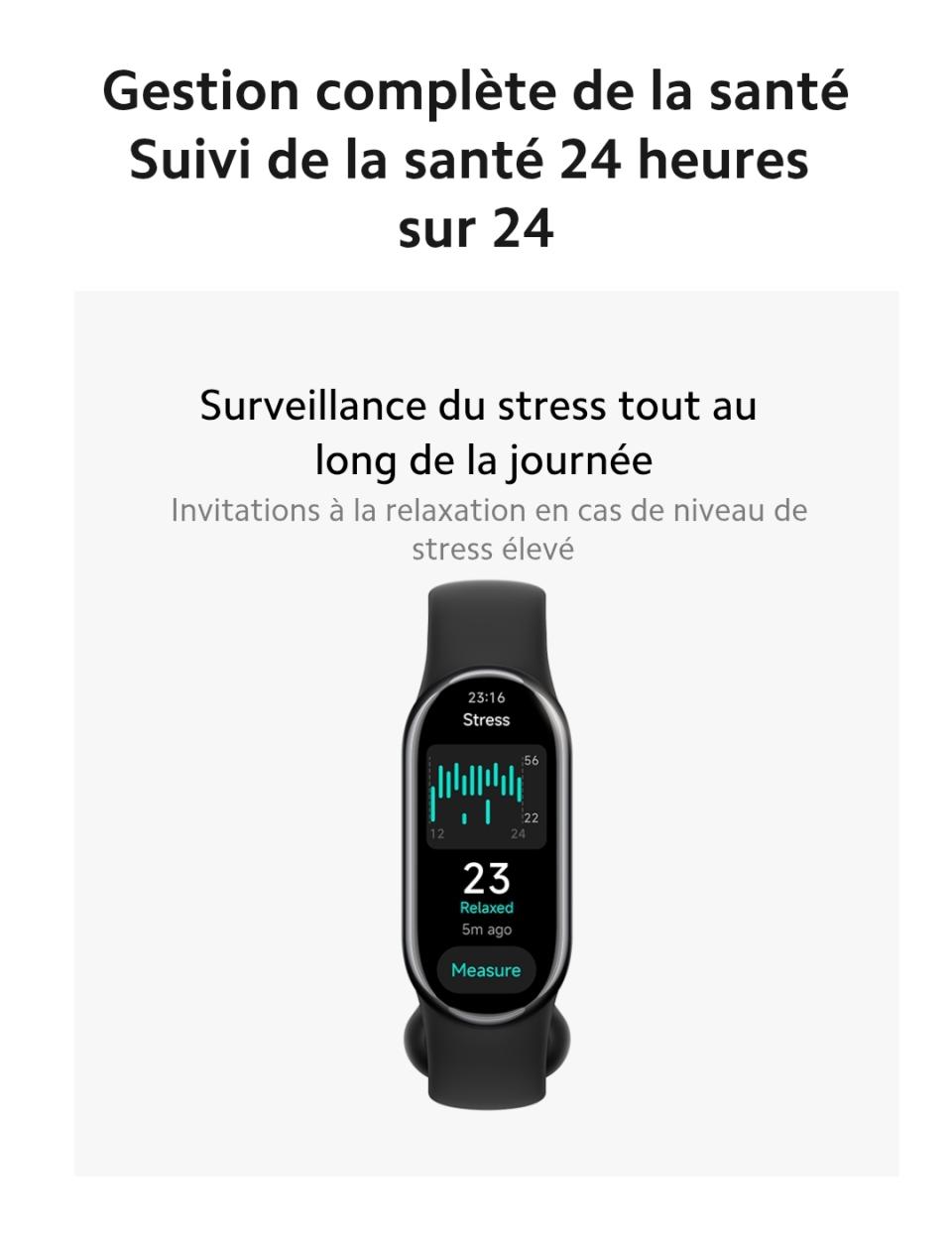 Ecran AMOLED, surveillance de la fréquence cardiaque, du sommeil, du stress, etc... 150 modes sportifs, jusqu'à 16 jours d'autonomie.