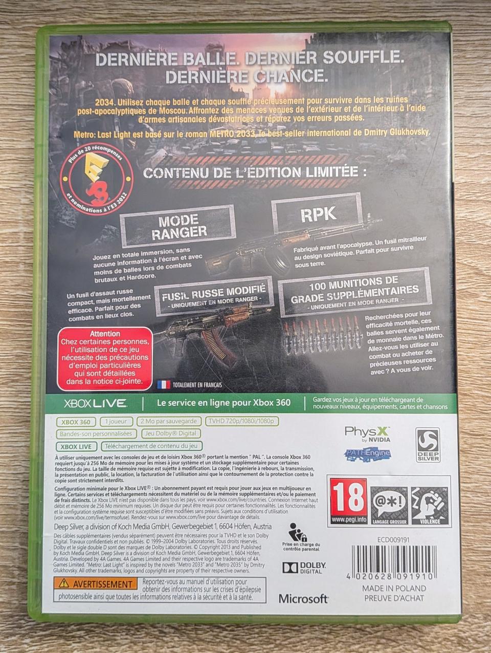 L2 - Metro : Last Light Edition Limitée Xbox 360 - EAN : 4020628091910 - ARTICLE OCCASION EN TRES BON ETAT GÉNÉRAL - BOITIER ORIGINAL - JEUX JOUABLE EN FRANCAIS - LIVRAISON ULTRA RAPIDE EN COLIS SUIVI PROTÈGE - COVER FR - ECD009191