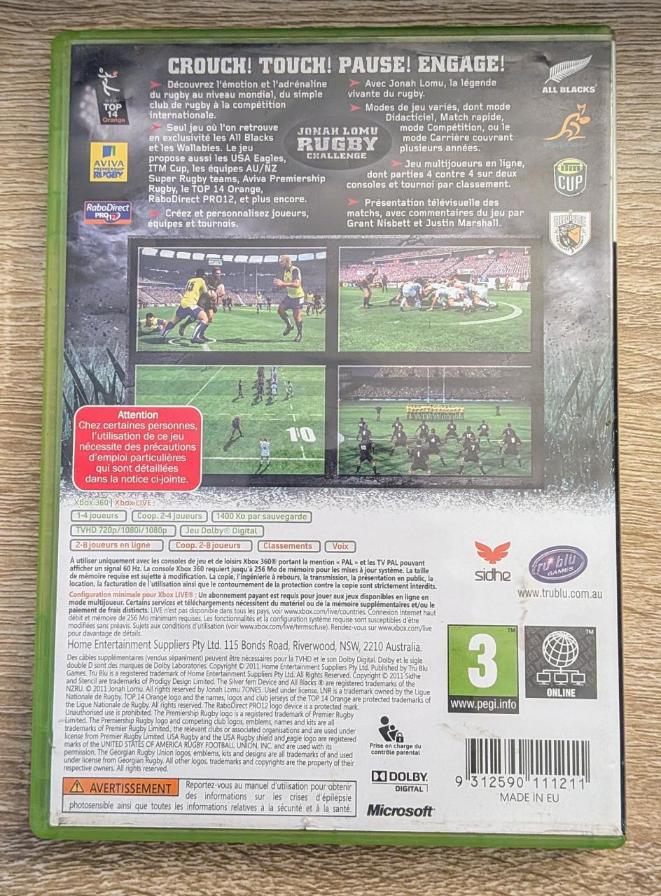 L2 - Jonah Lomu Rugby Challenge Xbox 360 - EAN : 9312590111211 - ARTICLE OCCASION EN TRES BON ETAT GÉNÉRAL - BOITIER ORIGINAL - JEUX JOUABLE EN FRANCAIS - LIVRAISON ULTRA RAPIDE EN COLIS SUIVI PROTÈGE - COVER FR