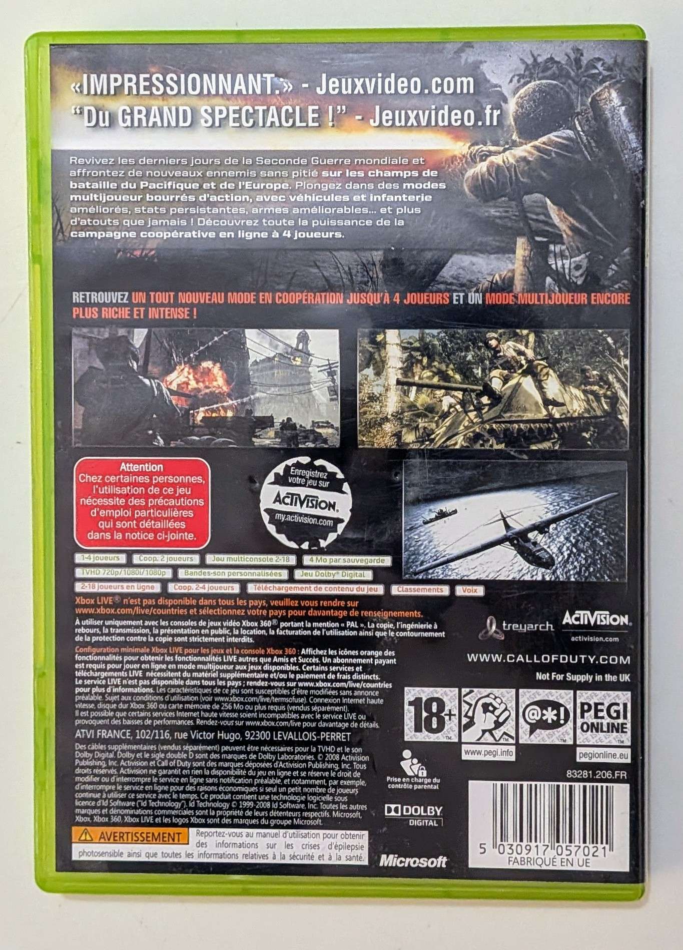L2 - Call Of Duty World At War Xbox 360 - EAN : 5030917057021 - ARTICLE D'OCCASION EN TRES BON ETAT GÉNÉRAL - BOITIER ORIGINAL - JEUX JOUABLE EN FRANCAIS - LIVRAISON ULTRA RAPIDE EN COLIS SUIVI PROTÈGE - COVER FR - SANS DOCUMENTATION + BONUS JEUX OFFERT