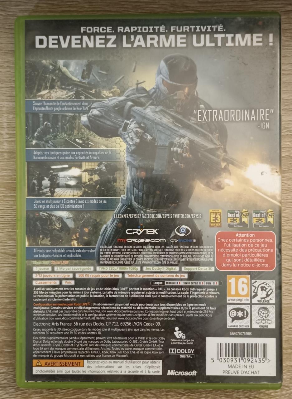 L2 - Crysis 2 Xbox 360 - EAN : 5030931092435 - ARTICLE OCCASION EN TRES BON ETAT GÉNÉRAL - BOITIER ORIGINAL - JEUX JOUABLE EN FRANCAIS - LIVRAISON ULTRA RAPIDE EN COLIS SUIVI PROTÈGE - COVER FR