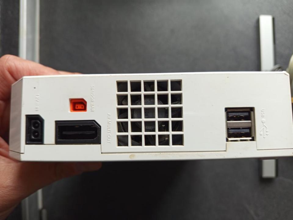 Cette Wii lit les jeux Game Cube, il y a des ports manettes et des ports cartes mémoire (une "patte" du clapet est cassée..