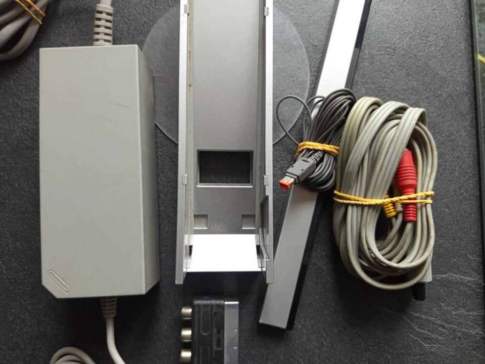 Console Nintendo Wii vendue avec ses câbles secteur, péritel, socle et sensor barre en état correct/moyen.