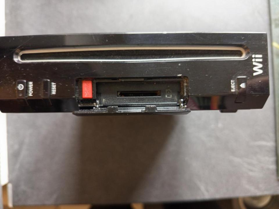 Cette Wii lit les jeux Game Cube, il y a des ports manettes (clapet absent) et des ports cartes mémoire.