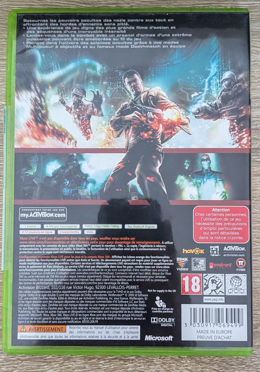 L3 - Wolfenstein Xbox 360 - EAN : 5030917069499 - ARTICLE OCCASION EN TRES BON ETAT GÉNÉRAL - BOITIER ORIGINAL XBOX 360 - JEUX JOUABLE EN FRANCAIS - LIVRAISON ULTRA RAPIDE EN COLIS SUIVI PROTÈGE - COVER FR - COMPLET