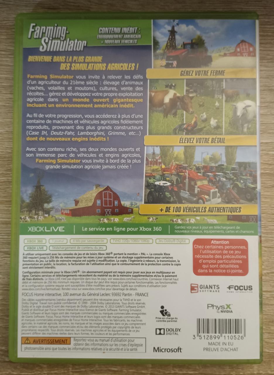 L1 - Farming Simulator 2013 Xbox 360 - EAN : 3512899110526 - ARTICLE OCCASION EN BON ETAT GÉNÉRAL - BOITIER ORIGINAL XBOX 360 - JEUX JOUABLE EN FRANCAIS - LIVRAISON ULTRA RAPIDE EN COLIS SUIVI PROTÈGE - COVER FR - COMPLET