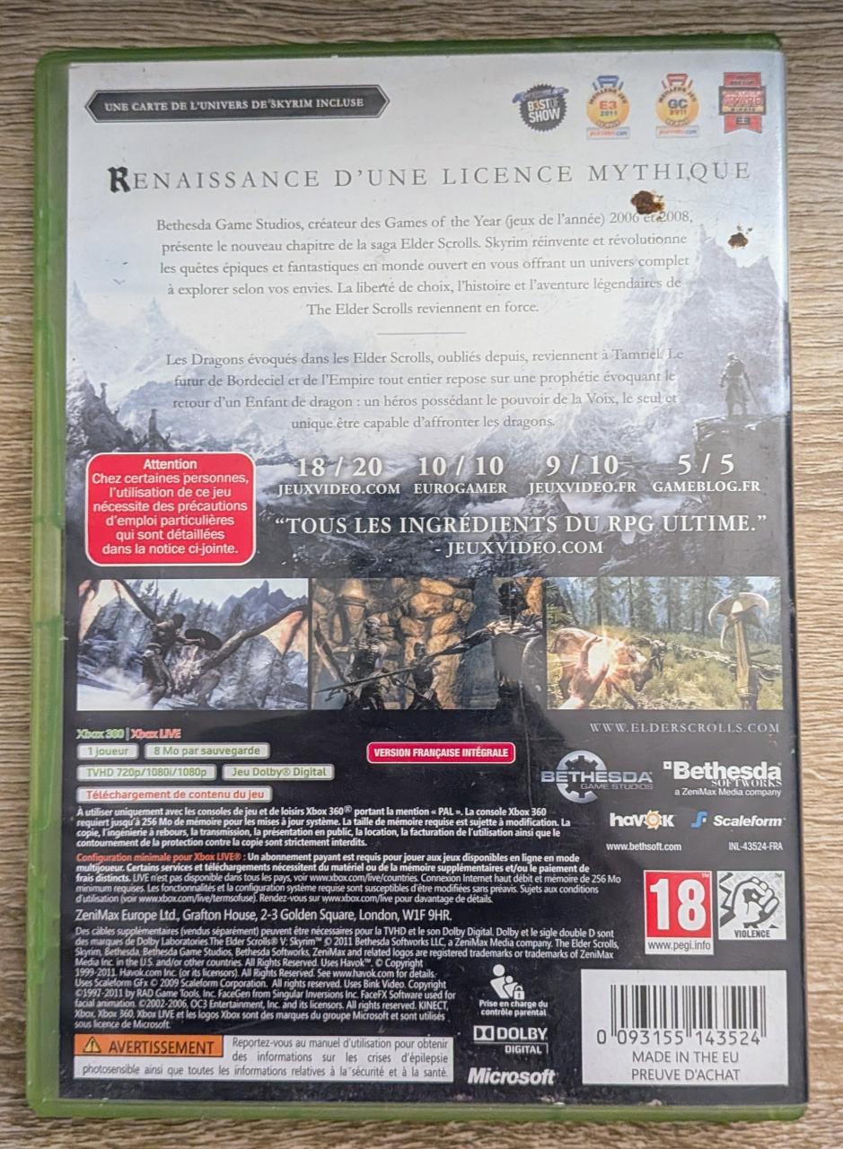 L1 - The Elder Scrolls V - Skyrim - Edition Limitée Xbox 360 - EAN : 0093155143524 - ARTICLE OCCASION EN TRES BON ETAT GÉNÉRAL - BOITIER ORIGINAL - JEUX JOUABLE EN FRANCAIS - LIVRAISON ULTRA RAPIDE EN COLIS SUIVI PROTÈGE - COVER FR