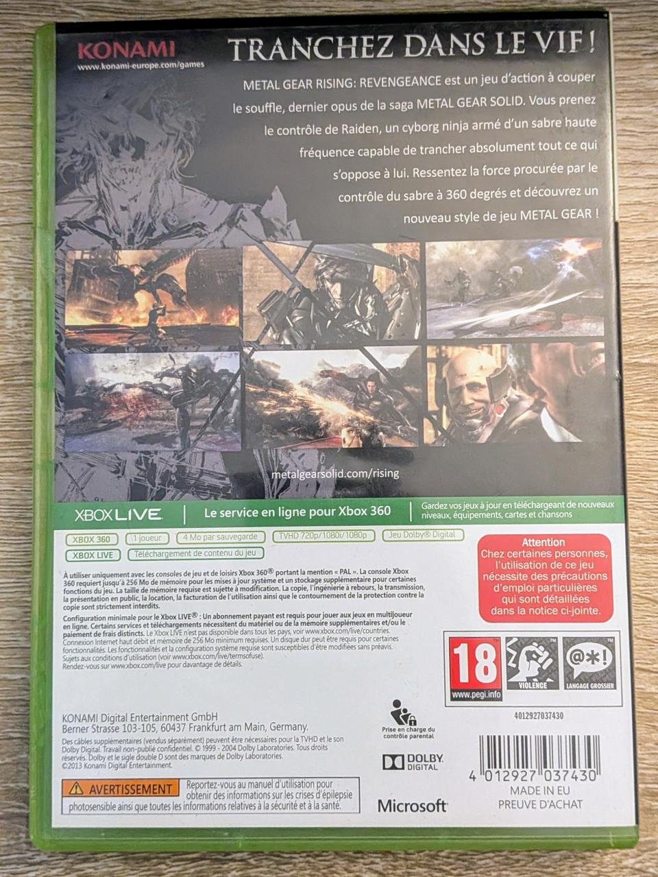 L3 - Metal Gear Rising - Revengeance Xbox 360 - EAN : 4012927037430 - ARTICLE OCCASION EN TRES BON ETAT GÉNÉRAL - BOITIER ORIGINAL XBOX 360 - JEUX JOUABLE EN FRANCAIS - LIVRAISON ULTRA RAPIDE EN COLIS SUIVI PROTÈGE - COVER FR
