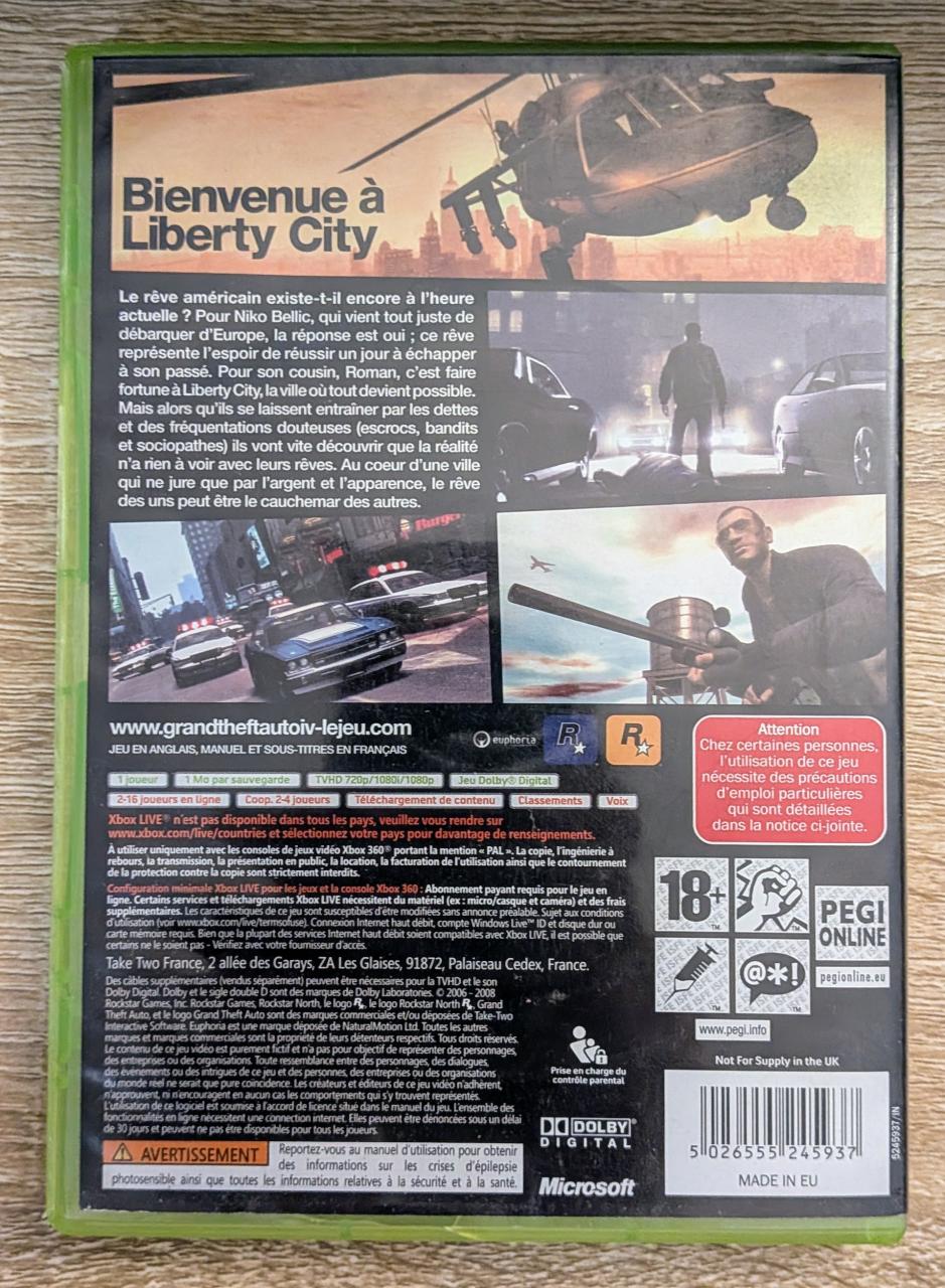 L1 - Gta 4 Xbox 360 - EAN : 5026555245937- ARTICLE D'OCCASION EN TRES BON ETAT GÉNÉRAL - BOITIER ORIGINAL - JEUX JOUABLE EN FRANCAIS - LIVRAISON ULTRA RAPIDE EN COLIS SUIVI PROTÈGE - COVER E.U - COMPLET