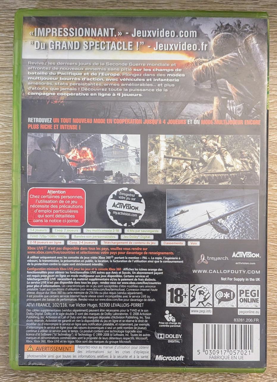 L1 - Call Of Duty World At War Xbox 360 - EAN : 5030917057021 - ARTICLE D'OCCASION EN TRES BON ETAT GÉNÉRAL - BOITIER ORIGINAL - JEUX JOUABLE EN FRANCAIS - LIVRAISON ULTRA RAPIDE EN COLIS SUIVI PROTÈGE - COVER FR - COMPLET