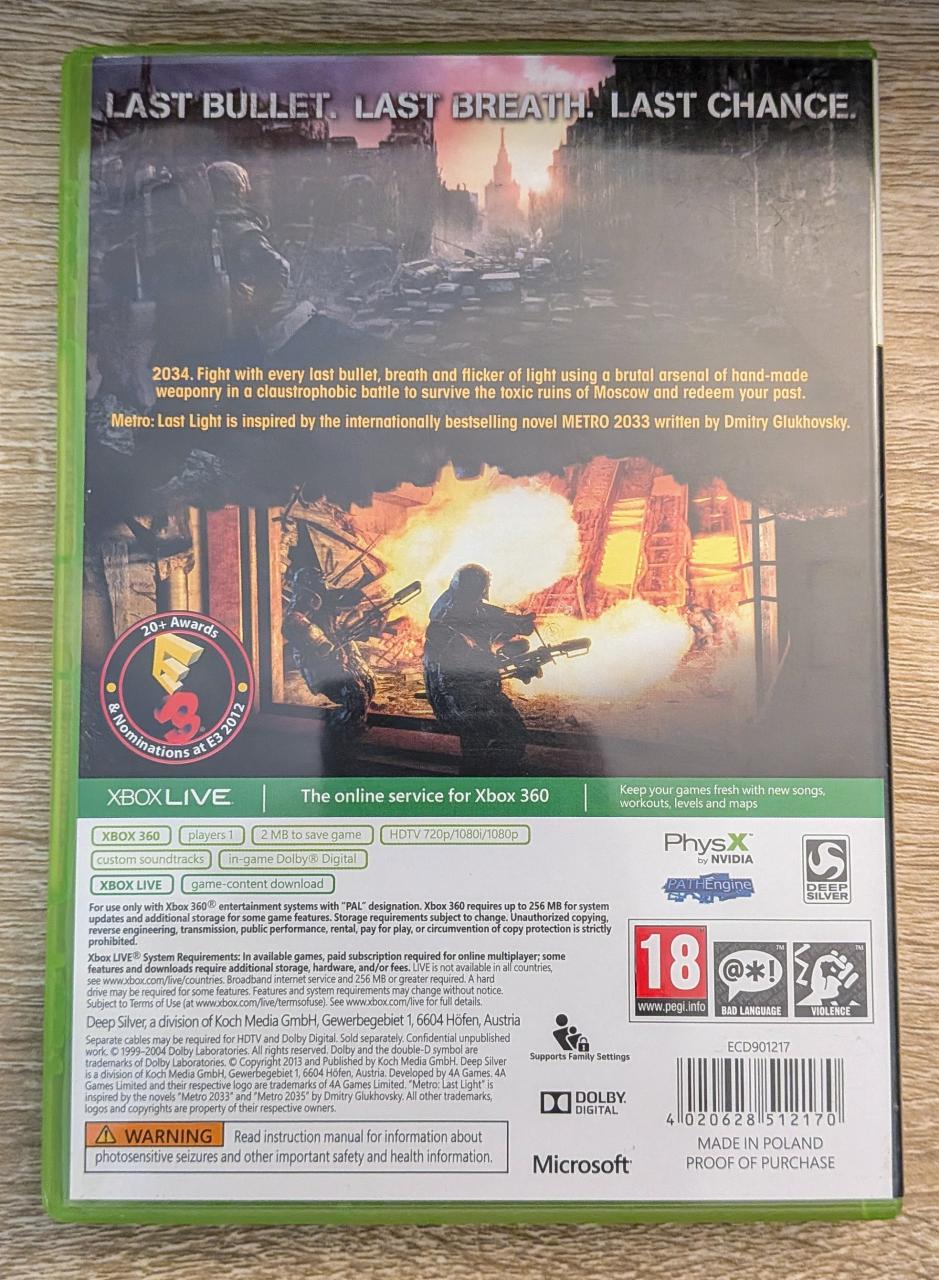 L1 - Metro - Last Light Xbox 360 - EAN : 4020628512170 - ARTICLE OCCASION EN TRES BON ETAT GÉNÉRAL - BOITIER ORIGINAL - JEUX JOUABLE EN FRANCAIS - LIVRAISON ULTRA RAPIDE EN COLIS SUIVI PROTÈGE - COVER E.U