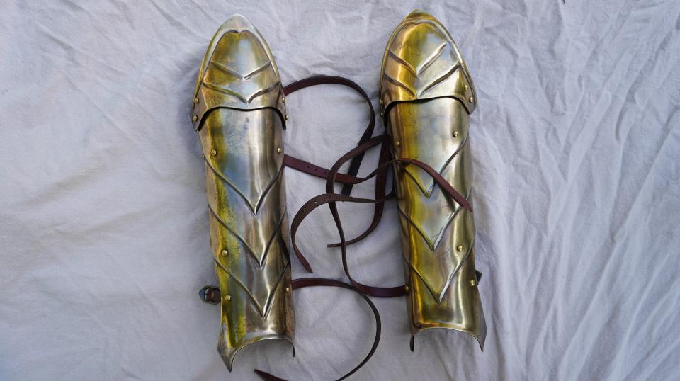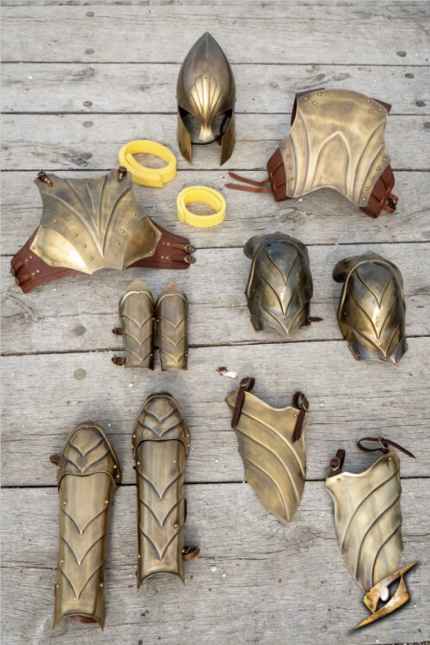 Comprend : cuirasse, casque, épaulettes, tassettes, brassards et jambières.