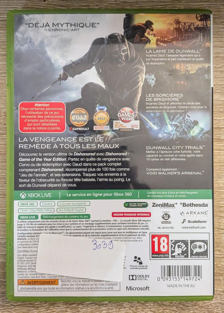 L2 - Dishonored - Game Of The Year Xbox 360 - EAN : 0093155149724 - ARTICLE OCCASION EN TRES BON ETAT GÉNÉRAL - BOITIER ORIGINAL XBOX 360 - JEUX JOUABLE EN FRANCAIS - LIVRAISON ULTRA RAPIDE EN COLIS SUIVI PROTÈGE - COVER FR - COMPLET