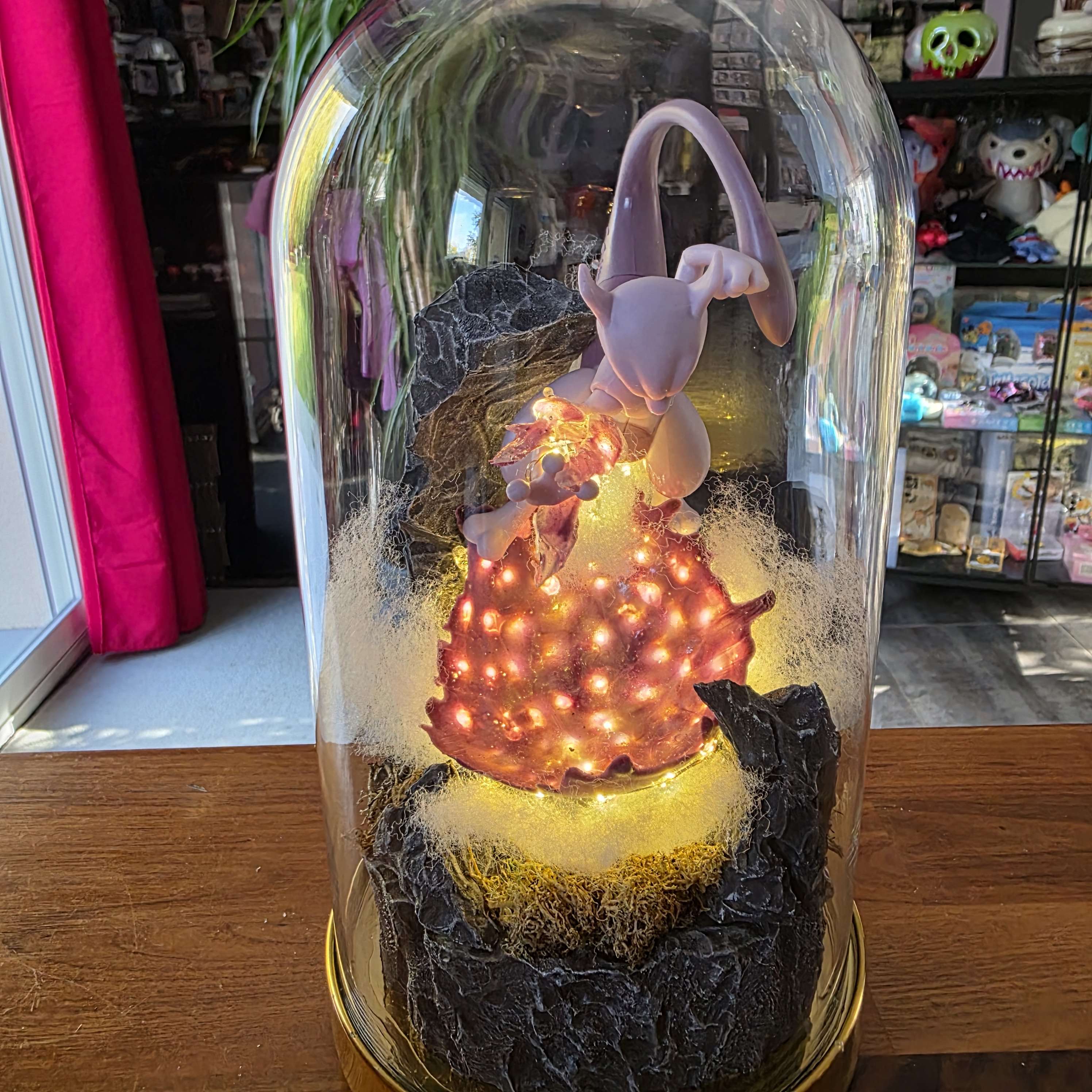 Plongez dans l'univers de Pokémon avec ce diorama artisanal unique, entièrement fait main à partir de figurines officielles. Cette création met en scène Mewtwo dans un décor lui correspondant, sous une cloche en verre.