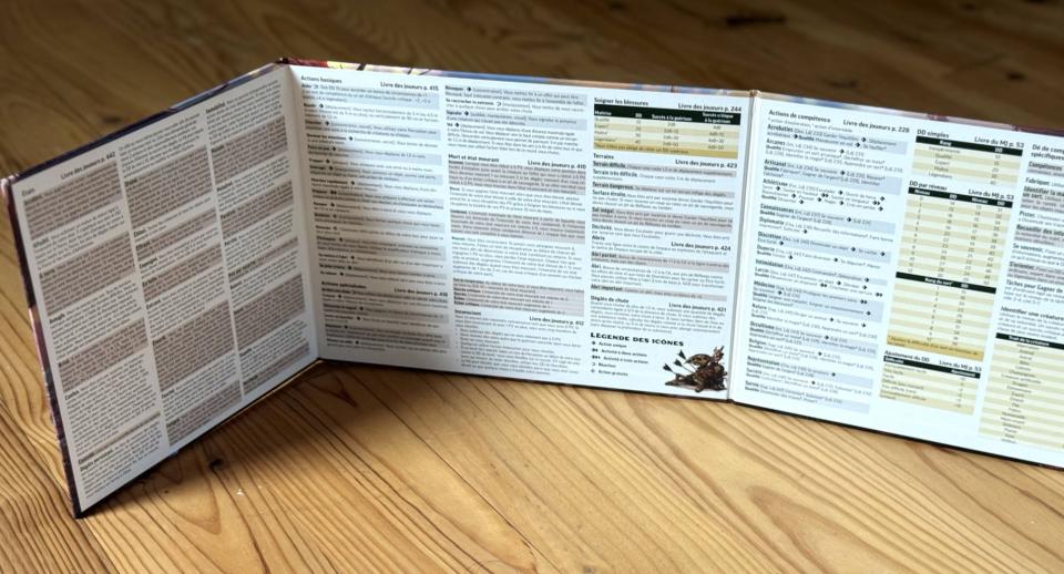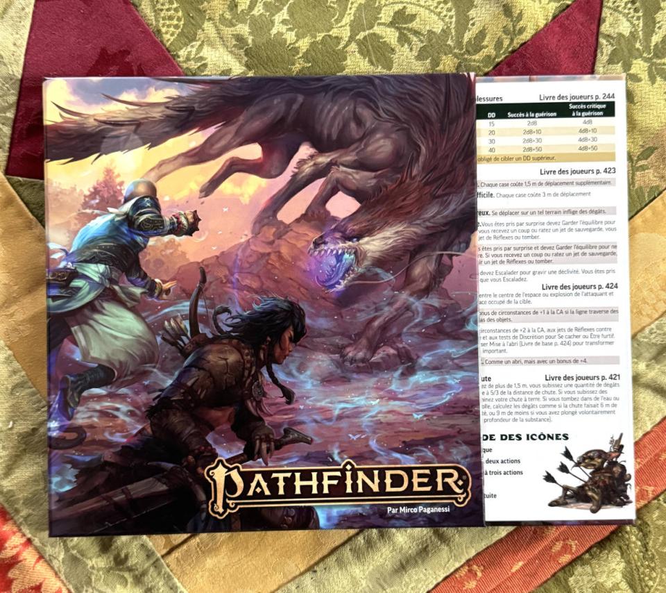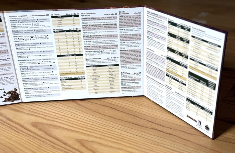 Ce magnifique écran au format paysage est fait de quatre panneaux. Il est magnifiquement illustré par Mirco Paganessi sur la face visible aux joueurs, et propose de nombreux tableaux et récapitulatifs de règles du côté réservé au MJ pour vous faire gagner du temps en regroupant les modificateurs clefs et autres informations.