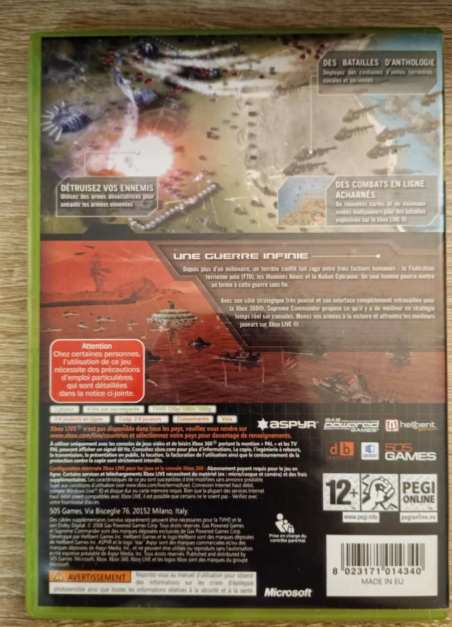 L1 - Supreme Commander Xbox 360 - EAN : 8023171014340 - ARTICLE OCCASION EN TRES BON ETAT GÉNÉRAL - BOITIER ORIGINAL XBOX 360 - JEUX JOUABLE EN FRANCAIS - LIVRAISON ULTRA RAPIDE EN COLIS SUIVI PROTÈGE - COVER FR - COMPLET