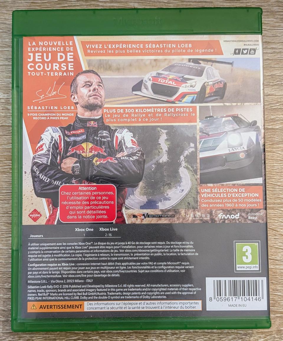 L2 - Sebastien Loeb Rally Evo Xbox One - EAN : 8059617104146 - ARTICLE OCCASION EN TRES BON ETAT GÉNÉRAL - BOITIER ORIGINAL - JEUX JOUABLE EN FRANCAIS - LIVRAISON ULTRA RAPIDE EN COLIS SUIVI PROTÈGE - COVER FR
