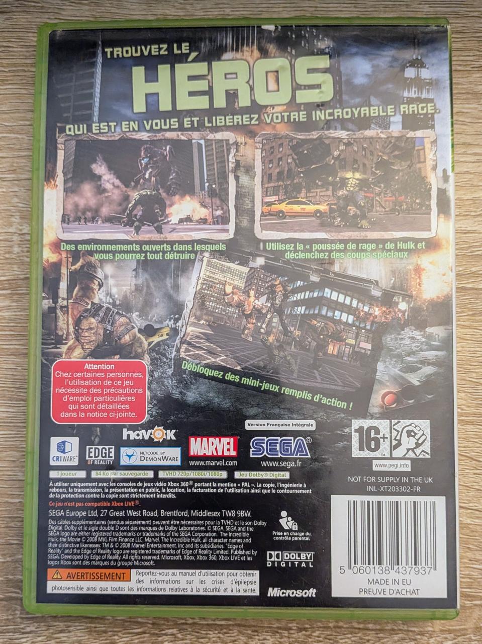 L1 - L'Incroyable Hulk Xbox 360 / EAN : 5060138437937- ARTICLE D'OCCASION EN TRES BON ETAT GÉNÉRAL - BOITIER ORIGINAL - JEUX JOUABLE EN FRANCAIS - LIVRAISON ULTRA RAPIDE EN COLIS SUIVI PROTÈGE -COVER FR - COMPLET