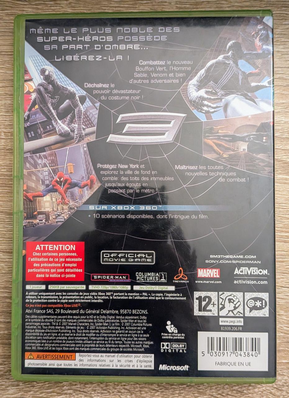 L3 : SPIDER-MAN 3 XBOX 360 - COMME NEUF COLLECTION - COMPLET (CIB)] / EAN : 5030917043840 / ARTICLE RARE DANS CET ÉTAT / DISQUE : Absolument sans rayure / COMPLET : Livré avec son Boîtier original Xbox 360, sa jaquette (Cover FR) et sa Notice officielle. Tous les éléments sont impeccables. / JEUX JOUABLE EN FRANCAIS. / LIVRAISON : Envoi ULTRA RAPIDE en Colis Suivi et très protégé (carton rigide) pour garantir un maintien de cet état parfait.