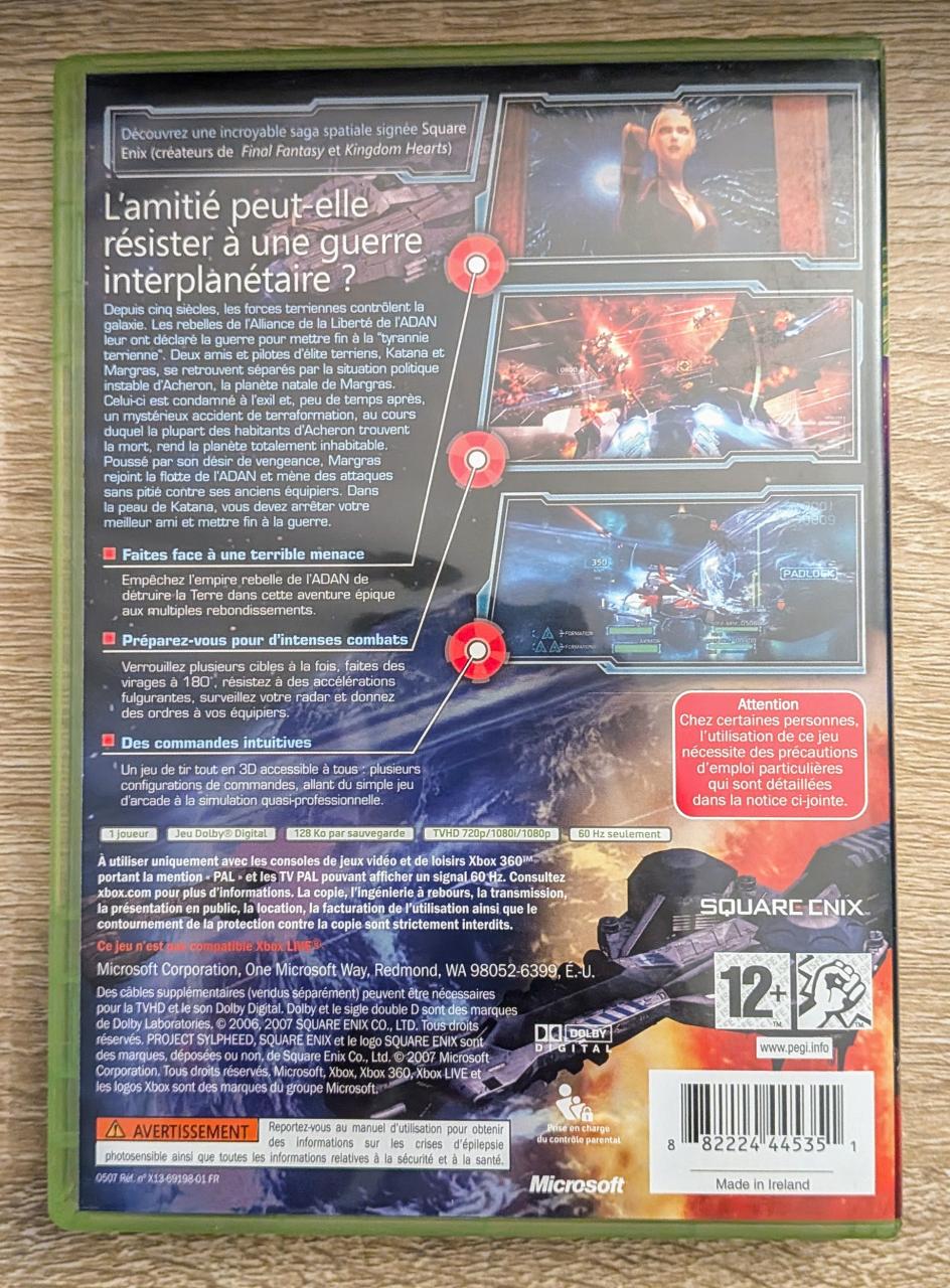 L3 : Project sylpheed Xbox 360 - COMME NEUF COLLECTION - COMPLET (CIB)] / EAN : 882224445351 / ARTICLE RARE DANS CET ÉTAT / DISQUE : Absolument sans rayure / COMPLET : Livré avec son Boîtier original Xbox 360, sa jaquette (Cover FR) et sa Notice officielle. Tous les éléments sont impeccables. / JEUX JOUABLE EN FRANCAIS. / LIVRAISON : Envoi ULTRA RAPIDE en Colis Suivi et très protégé pour garantir un maintien de cet état parfait.
