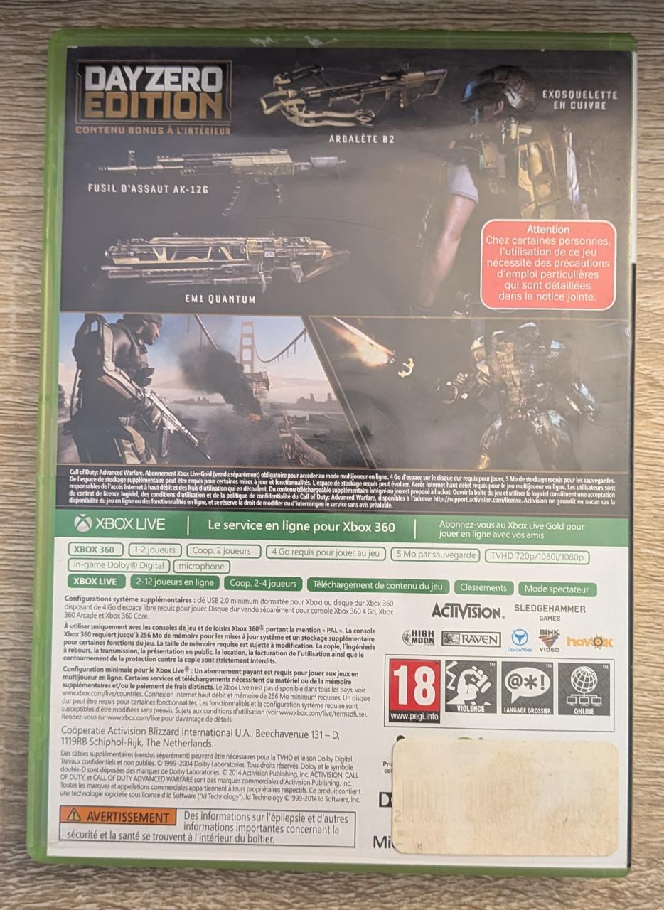 L2 - Call Of Duty - Advanced Warfare - Day Zero Edition Xbox 360 / EAN : 5030917147654 - ARTICLE D'OCCASION EN TRES BON ETAT GÉNÉRAL - BOITIER ORIGINAL XBOX 360 - JEUX ET COVER EN FRANCAIS - LIVRAISON ULTRA RAPIDE EN COLIS SUIVI PROTÈGE - SANS DOCUMENTATION + BONUS JEUX OFFERT