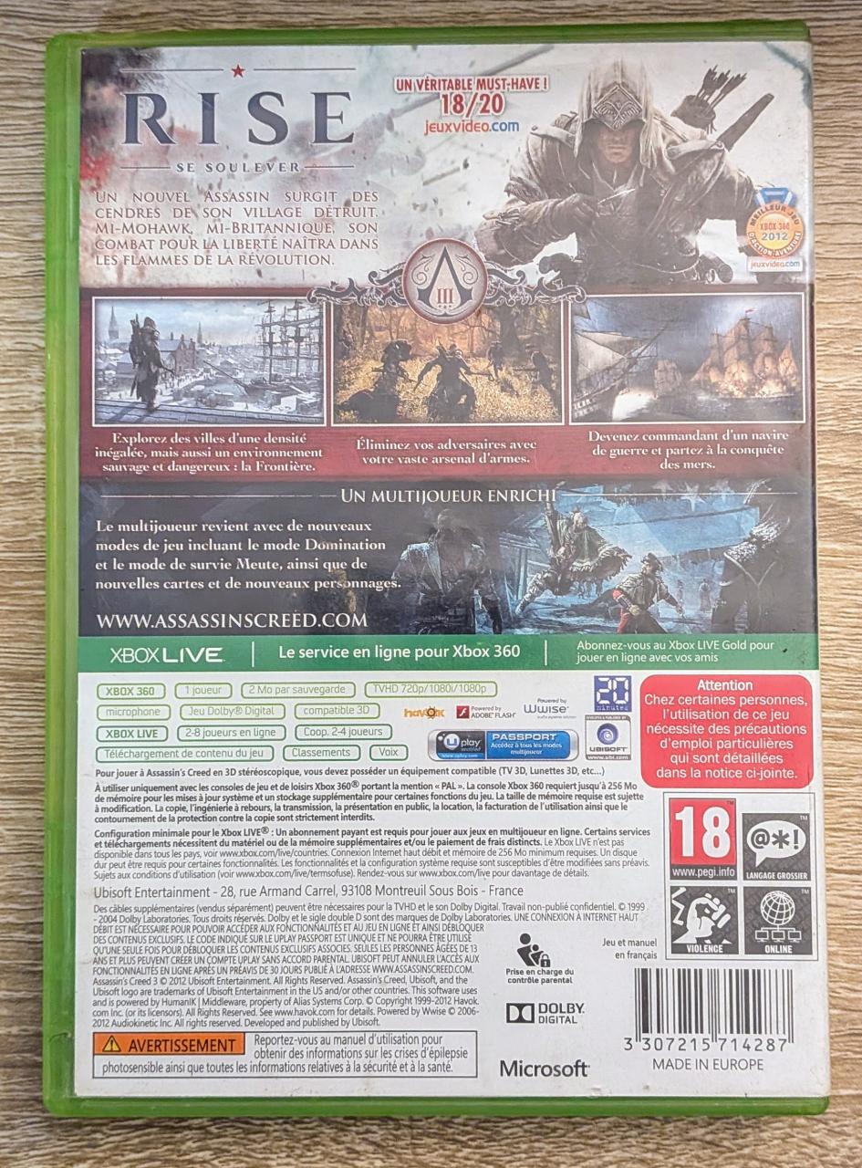 L1 - Assassin's Creed 3 Xbox 360 - EAN : 3307215714287 - ARTICLE OCCASION EN TRES BON ETAT GÉNÉRAL - BOITIER ORIGINAL XBOX 360 - JEUX JOUABLE EN FRANCAIS - LIVRAISON ULTRA RAPIDE EN COLIS SUIVI PROTÈGE - COVER FR
