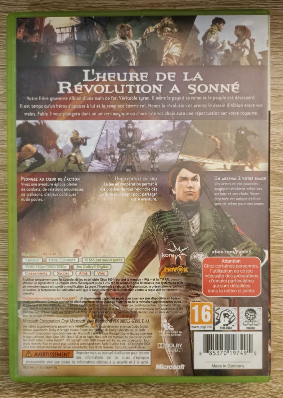 L1 -Fable Iii Xbox 360 - EAN : 885370197495 - ARTICLE OCCASION EN TRES BON ETAT GÉNÉRAL - BOITIER ORIGINAL XBOX 360 - JEUX JOUABLE EN FRANCAIS - LIVRAISON ULTRA RAPIDE EN COLIS SUIVI PROTÈGE - COVER FR - COMPLET