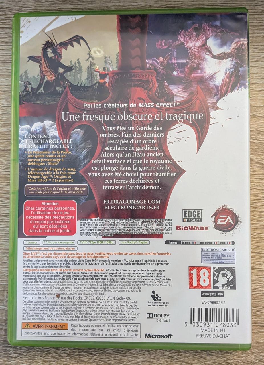 L3 - Dragon Age Origins Xbox 360 - EAN : 5030931078033 - ARTICLE OCCASION EN TRES BON ETAT GÉNÉRAL - BOITIER ORIGINAL XBOX 360 - JEUX JOUABLE EN FRANCAIS - LIVRAISON ULTRA RAPIDE EN COLIS SUIVI PROTÈGE - COVER FR - COMPLET