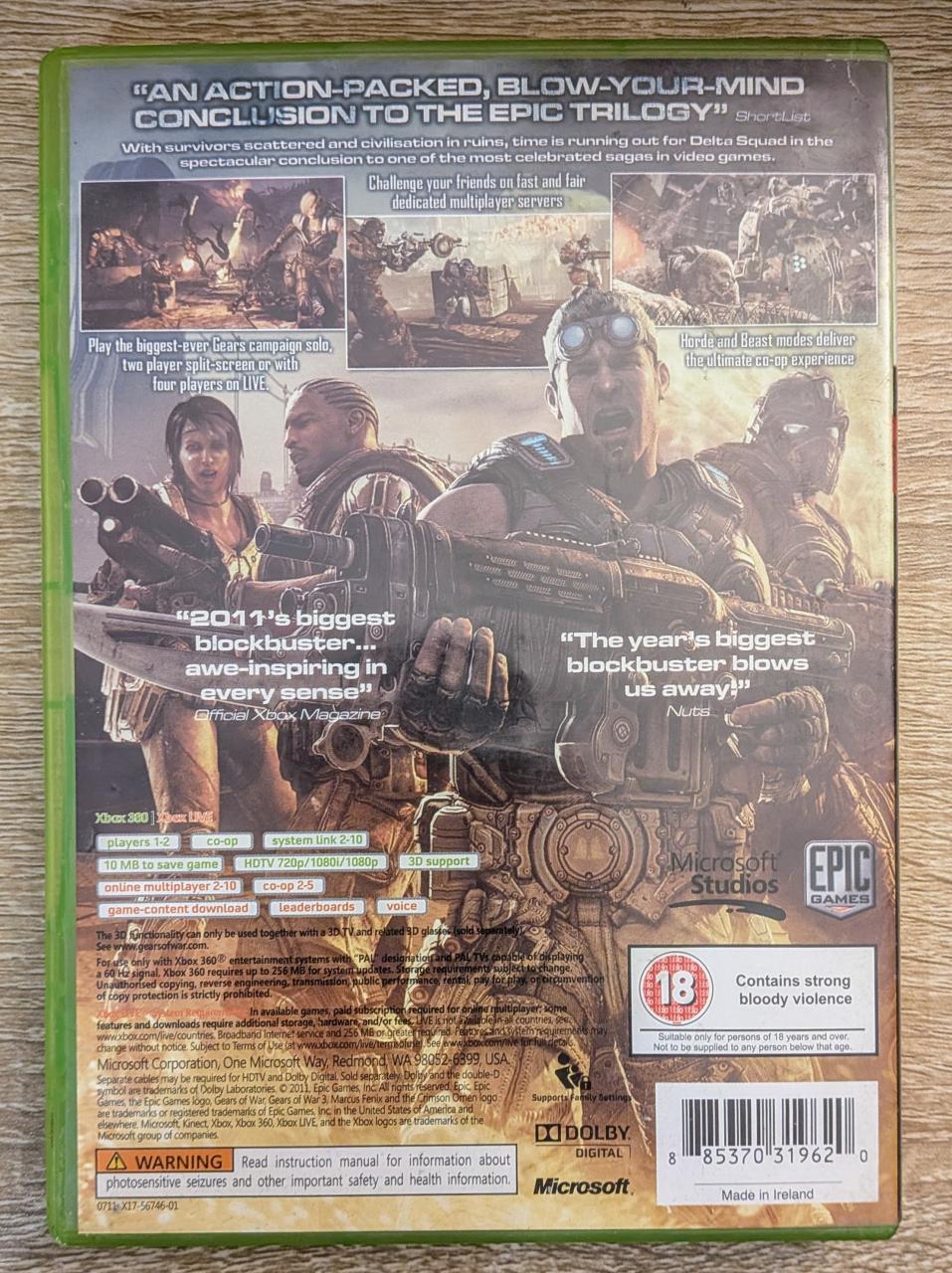 L1 - Gears Of War 3 Xbox 360 - EAN : 885370319620 - ARTICLE OCCASION EN TRES BON ETAT GÉNÉRAL - BOITIER ORIGINAL XBOX 360 - JEUX JOUABLE EN FRANCAIS - LIVRAISON ULTRA RAPIDE EN COLIS SUIVI PROTÈGE - COVER E.U - COMPLET