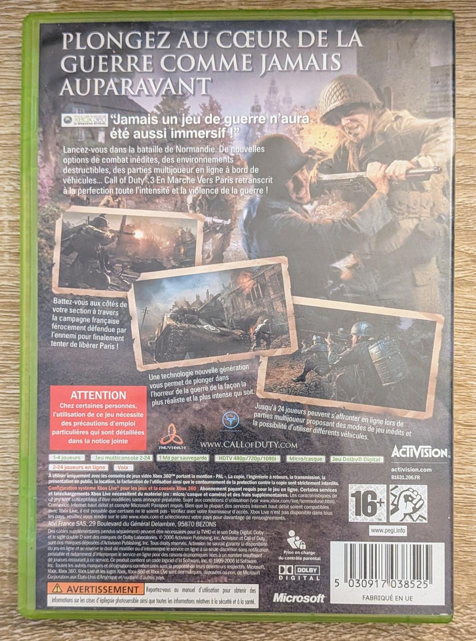 L1 - Call Of Duty 3 - En Marche Vers Paris Xbox 360 / EAN : 5030917038525 - ARTICLE D'OCCASION EN TRES BON ETAT GÉNÉRAL - BOITIER ORIGINAL - JEUX JOUABLE EN FRANCAIS - LIVRAISON ULTRA RAPIDE EN COLIS SUIVI PROTÈGE -COVER FR - COMPLET CIB