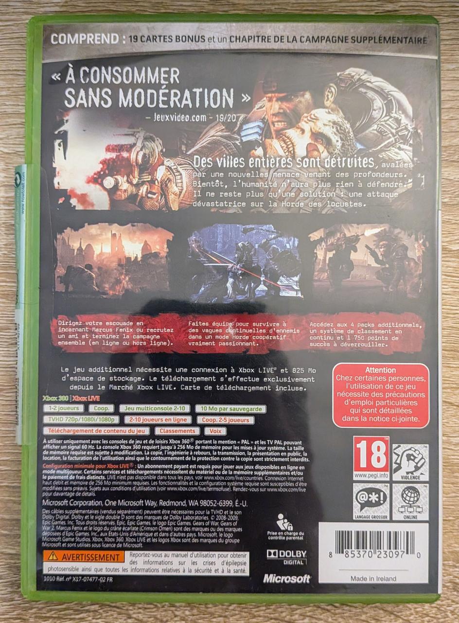 L3 - Gears Of War 2 - Classics Xbox 360 - EAN : 885370230970 - ARTICLE OCCASION EN TRES BON ETAT GÉNÉRAL - BOITIER ORIGINAL XBOX 360 - JEUX JOUABLE EN FRANCAIS - LIVRAISON ULTRA RAPIDE EN COLIS SUIVI PROTÈGE - COVER FR - COMPLET CID