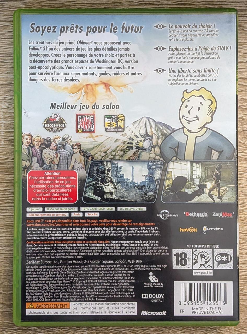 L3 - Fallout 3 Xbox 360 - EAN : 093155125513 - ARTICLE OCCASION EN TRES BON ETAT GÉNÉRAL - BOITIER ORIGINAL XBOX 360 - JEUX JOUABLE EN FRANCAIS - LIVRAISON ULTRA RAPIDE EN COLIS SUIVI PROTÈGE - COVER FR - COMPLET CIB