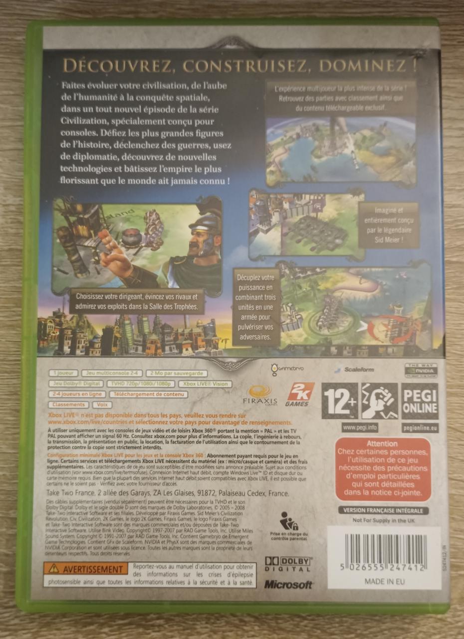 L2 - Sid Meier's Civilization Revolution Xbox 360 - EAN : 5026555247412 - ARTICLE OCCASION EN TRES BON ETAT GÉNÉRAL - BOITIER ORIGINAL XBOX 360 - JEUX JOUABLE EN FRANCAIS - LIVRAISON ULTRA RAPIDE EN COLIS SUIVI PROTÈGE - COVER FR - COMPLET CIB