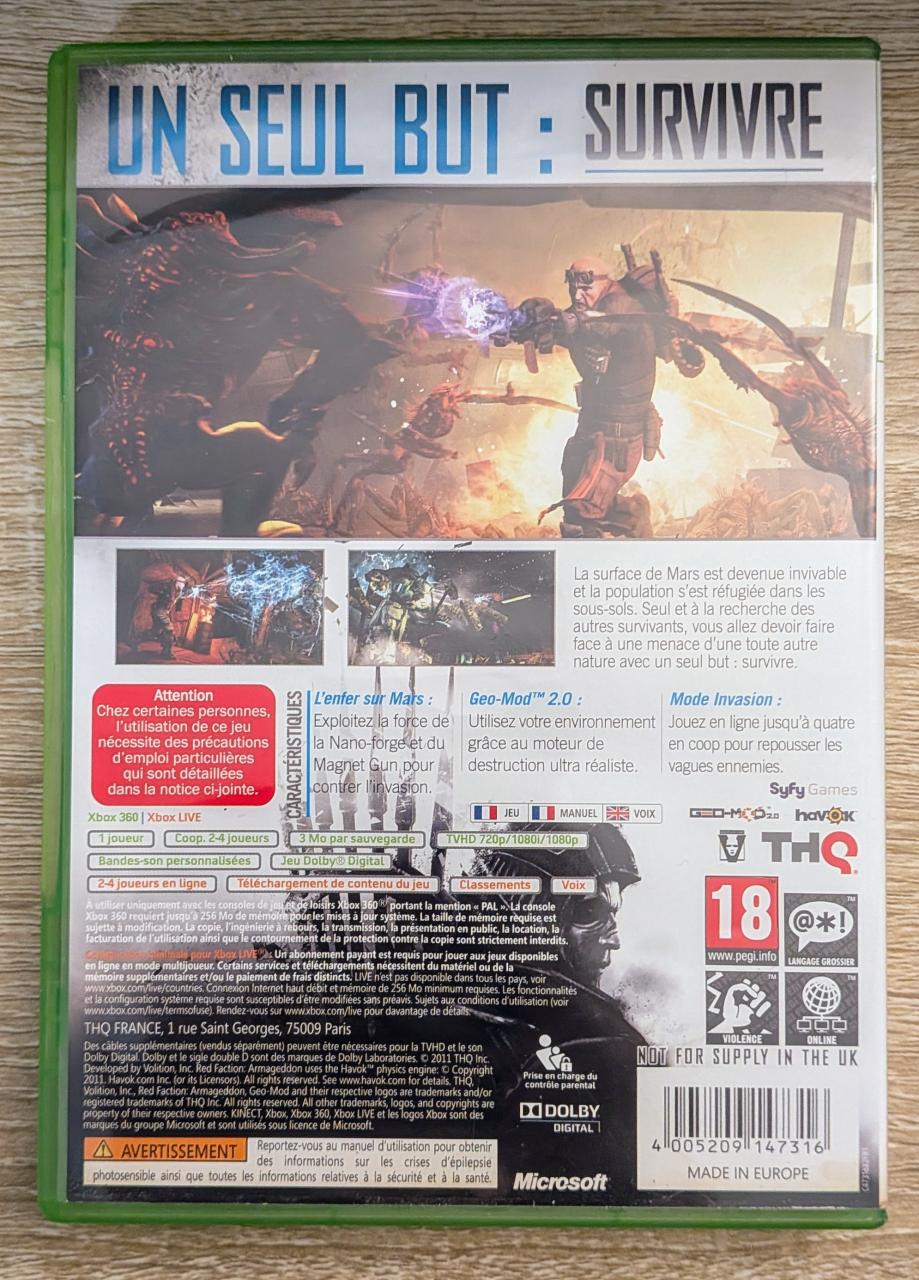 L1 - Red Faction - Armageddon Xbox 360 - EAN : 4005209147316 - ARTICLE OCCASION EN TRES BON ETAT GÉNÉRAL - BOITIER ORIGINAL XBOX 360 - JEUX JOUABLE EN FRANCAIS - LIVRAISON ULTRA RAPIDE EN COLIS SUIVI PROTÈGE - COVER E.U - COMPLET CID