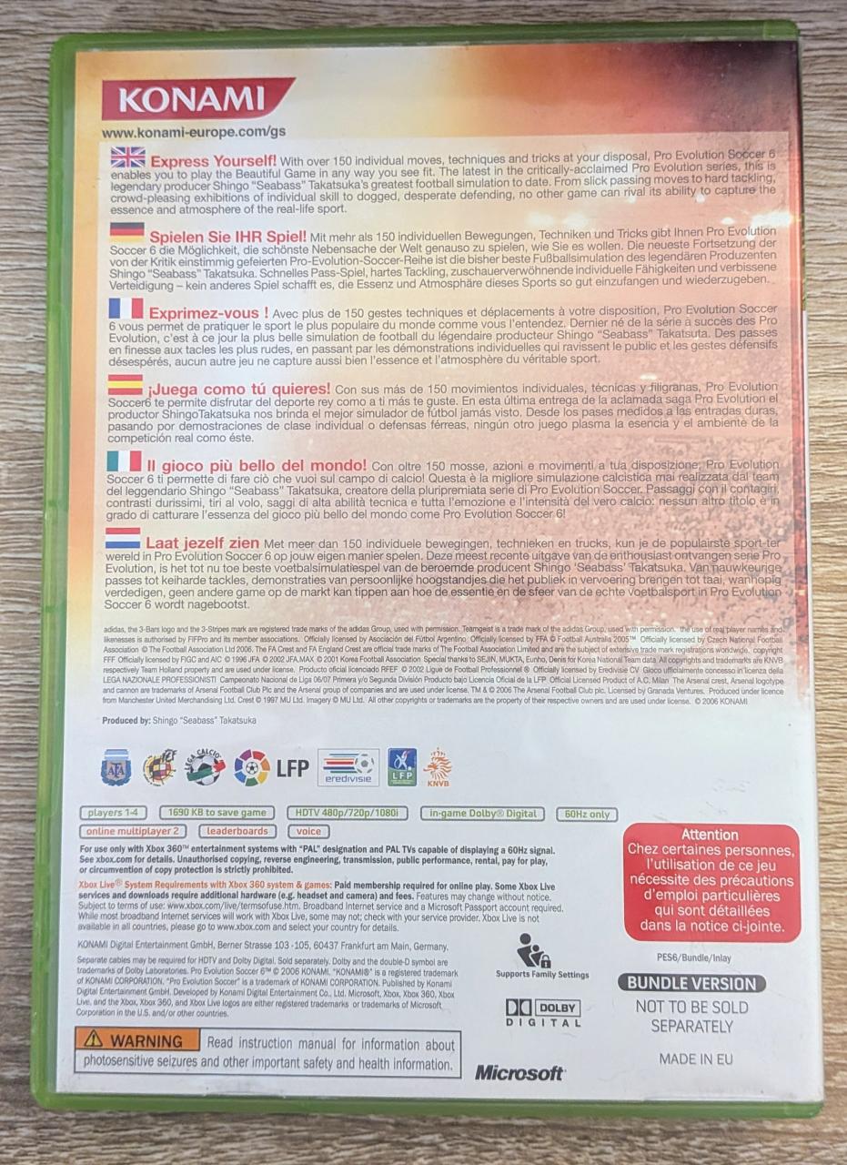 L1 -Pro Evolution Soccer 6 - PES 6 - Xbox 360 - EAN : 4012927032305 - ARTICLE OCCASION EN TRES BON ETAT GÉNÉRAL - BOITIER ORIGINAL XBOX 360 - JEUX JOUABLE EN FRANCAIS - LIVRAISON ULTRA RAPIDE EN COLIS SUIVI PROTÈGE - COVER FR - COMPLET CIB