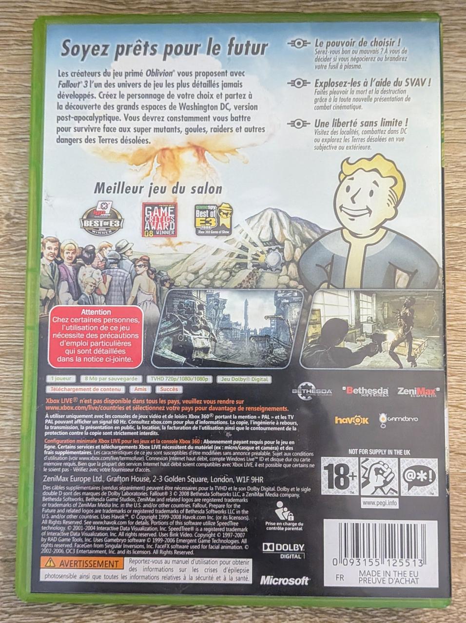 L3 -Fallout 3 Xbox 360 - EAN : 093155125513 - ARTICLE OCCASION EN TRES BON ETAT GÉNÉRAL - BOITIER ORIGINAL XBOX 360 - JEUX JOUABLE EN FRANCAIS - LIVRAISON ULTRA RAPIDE EN COLIS SUIVI PROTÈGE - COVER FR - COMPLET CIB