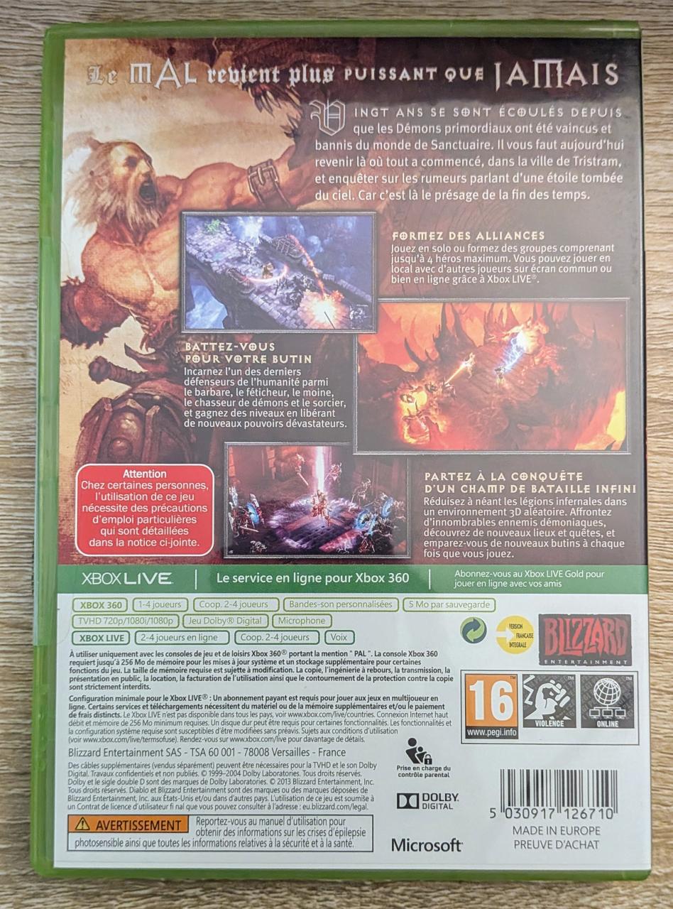 L1 - Diablo 3 Xbox 360 / EAN : 5030917126710 - ARTICLE OCCASION EN TRES BON ETAT GENERAL - TEST MACHINE OK - PACK COMPLET JOUABLE EN FRANCAIS - LIVRAISON SUPER RAPIDE EN COLIS SUIVI PROTEGE - COVER FR - COMPLET CIB