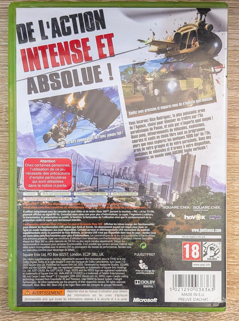 L3 - Just Cause 2 Xbox 360 - EAN : 5021290038363 - ARTICLE OCCASION EN TRES BON ETAT GÉNÉRAL - BOITIER ORIGINAL XBOX 360 - JEUX JOUABLE EN FRANCAIS - LIVRAISON ULTRA RAPIDE EN COLIS SUIVI PROTÈGE - COVER FR - COMPLET CIB