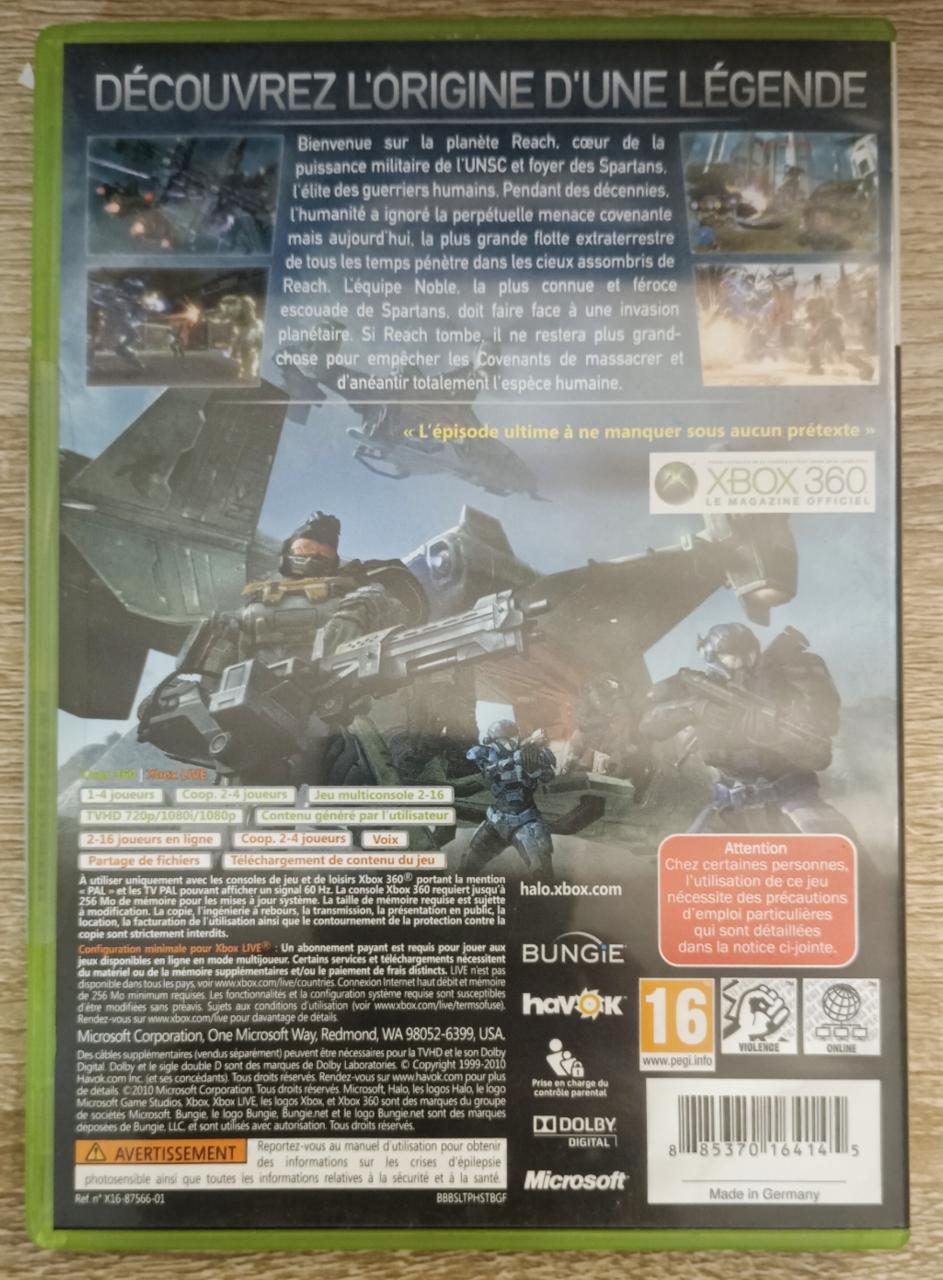 L1 - Halo Reach Xbox 360 / EAN : 885370164145 - ARTICLE OCCASION EN TRES BON ETAT GENERAL - TEST MACHINE OK - PACK COMPLET JOUABLE EN FRANCAIS - LIVRAISON SUPER RAPIDE EN COLIS SUIVI PROTEGE - COVER FR - COMPLET CIB