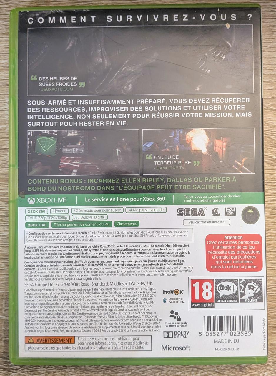L2 - Aliens - Isolation Xbox 360 - EAN : 5055277023585 - ARTICLE OCCASION EN TRES BON ETAT GÉNÉRAL - BOITIER ORIGINAL XBOX 360 - JEUX JOUABLE EN FRANCAIS - LIVRAISON ULTRA RAPIDE EN COLIS SUIVI PROTÈGE - COVER FR - COMPLET CIB