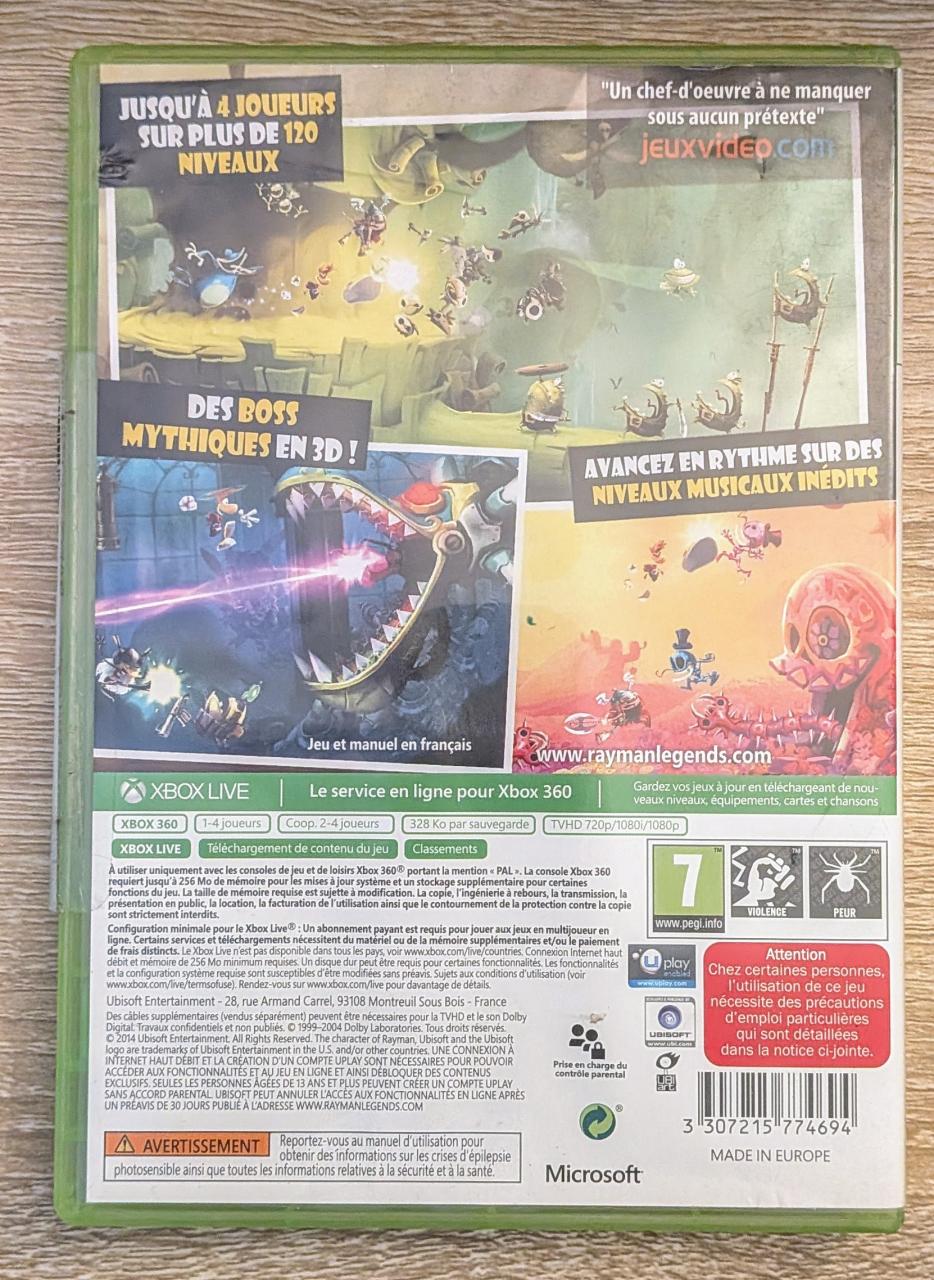 L1 - Rayman Legends Xbox 360 - EAN : 3307215842911 / 3307215774694 - ARTICLE OCCASION EN TRES BON ETAT GÉNÉRAL - BOITIER ORIGINAL XBOX 360 - JEUX JOUABLE EN FRANCAIS - LIVRAISON ULTRA RAPIDE EN COLIS SUIVI PROTÈGE - COVER FR
