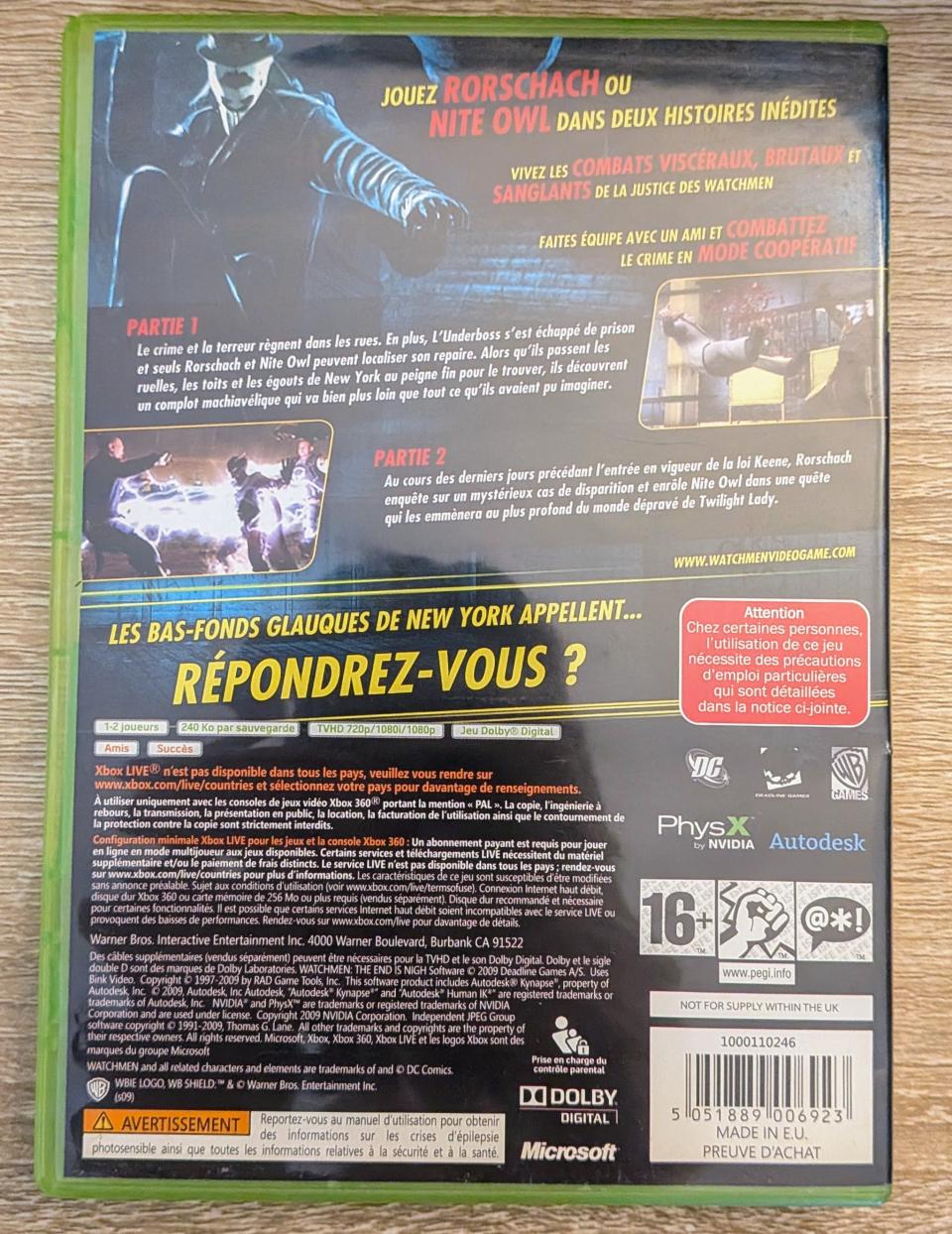 L3 - Watchmen - The End Is Nigh, Parts 1 & 2 Xbox 360 - EAN : 5051889006923 - ARTICLE OCCASION EN TRES BON ETAT GÉNÉRAL - BOITIER ORIGINAL XBOX 360 - JEUX JOUABLE EN FRANCAIS - LIVRAISON ULTRA RAPIDE EN COLIS SUIVI PROTÈGE - COVER FR - COMPLET