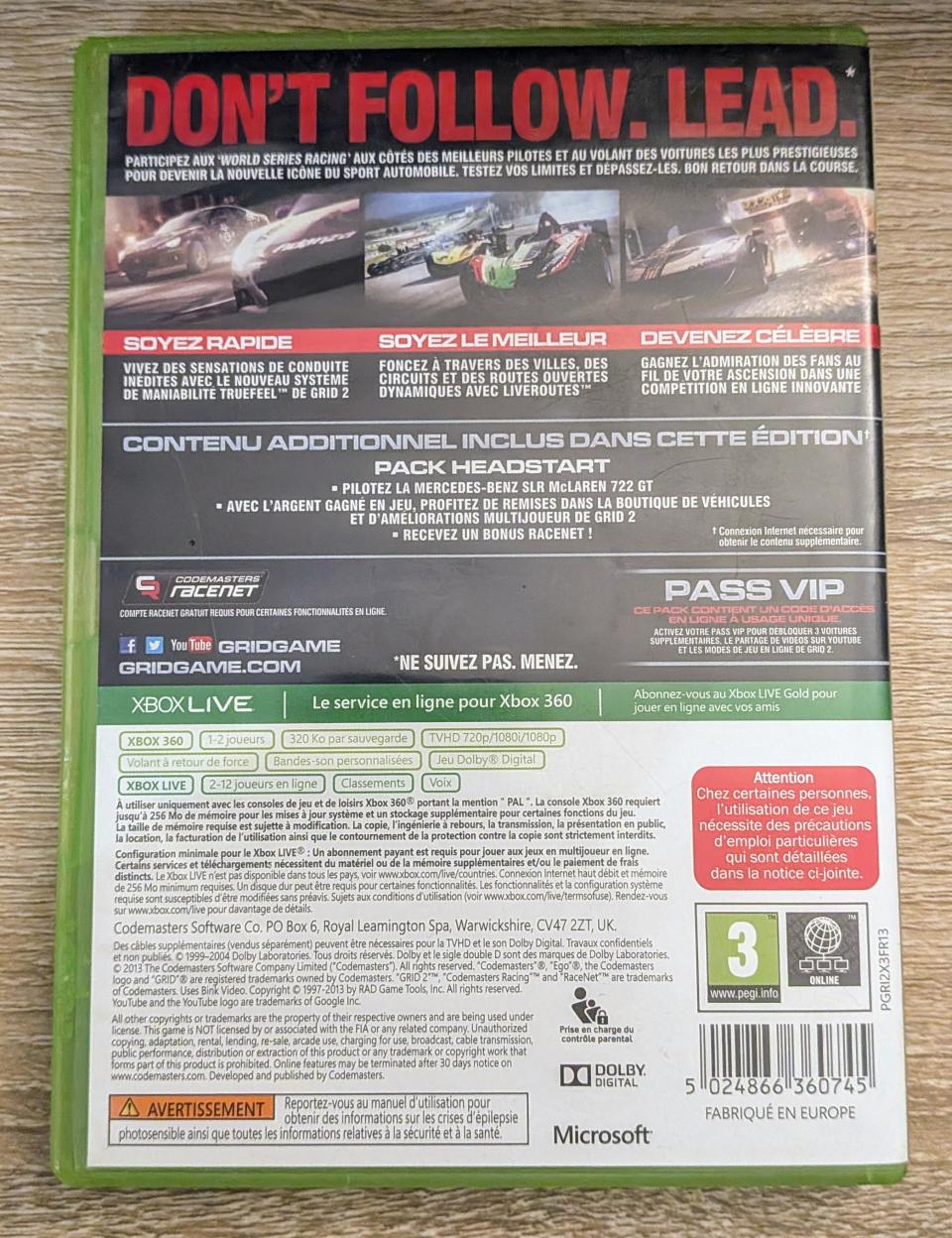 L3 - Race Driver Grid 2 - Limited Edition Xbox 360 - EAN : 5024866360745 - ARTICLE OCCASION EN TRES BON ETAT GÉNÉRAL - TEST MACHINE OK - BOITIER ORIGINAL XBOX 360 - JEUX JOUABLE EN FRANCAIS - LIVRAISON ULTRA RAPIDE EN COLIS SUIVI PROTÈGE - COVER E.U - COMPLET CIB