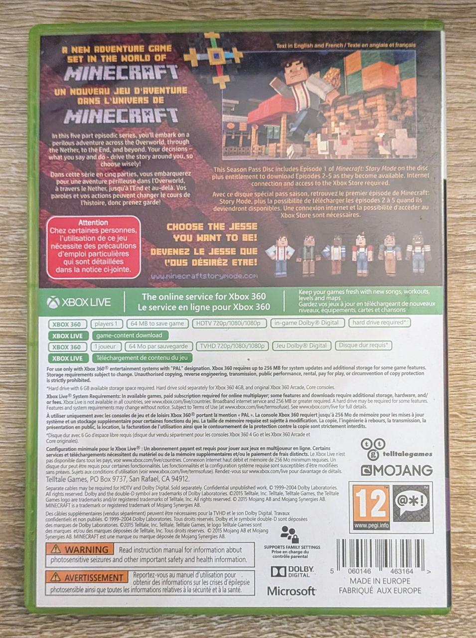 L2 - Minecraft - Story Mode Xbox 360 - EAN : 5060146463164 - ARTICLE OCCASION EN TRES BON ETAT GÉNÉRAL - TEST MACHINE OK - BOITIER ORIGINAL XBOX 360 - JEUX JOUABLE EN FRANCAIS - LIVRAISON ULTRA RAPIDE EN COLIS SUIVI PROTÈGE - COVER E.U - COMPLET CIB - TELLTALE GAMES SERIES