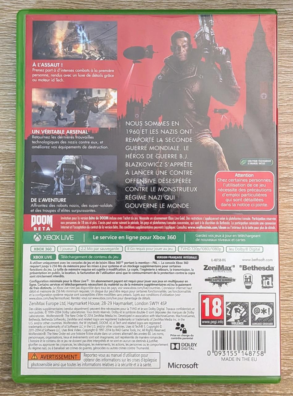 L1 - Wolfenstein - The New Order Xbox 360 - EAN : 093155148758 - ARTICLE OCCASION EN TRES BON ETAT GÉNÉRAL - BOITIER ORIGINAL XBOX 360 - JEUX JOUABLE EN FRANCAIS - LIVRAISON ULTRA RAPIDE EN COLIS SUIVI PROTÈGE - COVER FR - COMPLET CIB