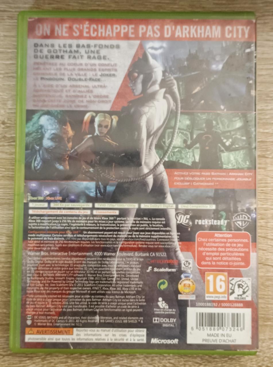 L3 - Batman : Arkham City Xbox 360 - EAN : 5051889073246 - ARTICLE OCCASION EN TRES BON ETAT GÉNÉRAL - BOITIER ORIGINAL XBOX 360 - JEUX JOUABLE EN FRANCAIS - LIVRAISON ULTRA RAPIDE EN COLIS SUIVI PROTÈGE - COVER FR - COMPLET CIB