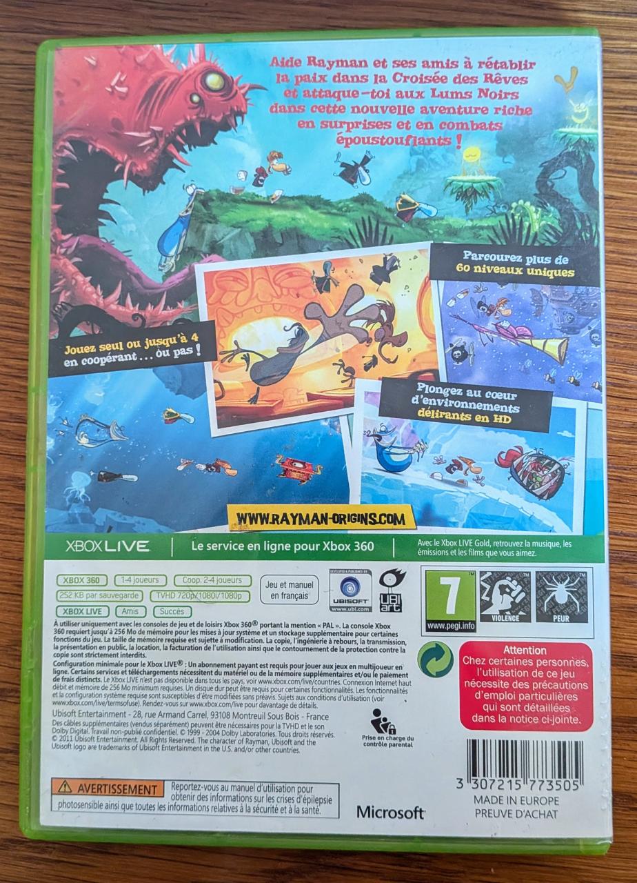 L3 - Rayman Origins Xbox 360 Classics Best Seller - EAN : 3307215773505 - ARTICLE OCCASION EN TRES BON ETAT GÉNÉRAL - BOITIER ORIGINAL XBOX 360 - JEUX JOUABLE EN FRANCAIS - LIVRAISON ULTRA RAPIDE EN COLIS SUIVI PROTÈGE - COVER FR - COMPLET CIB