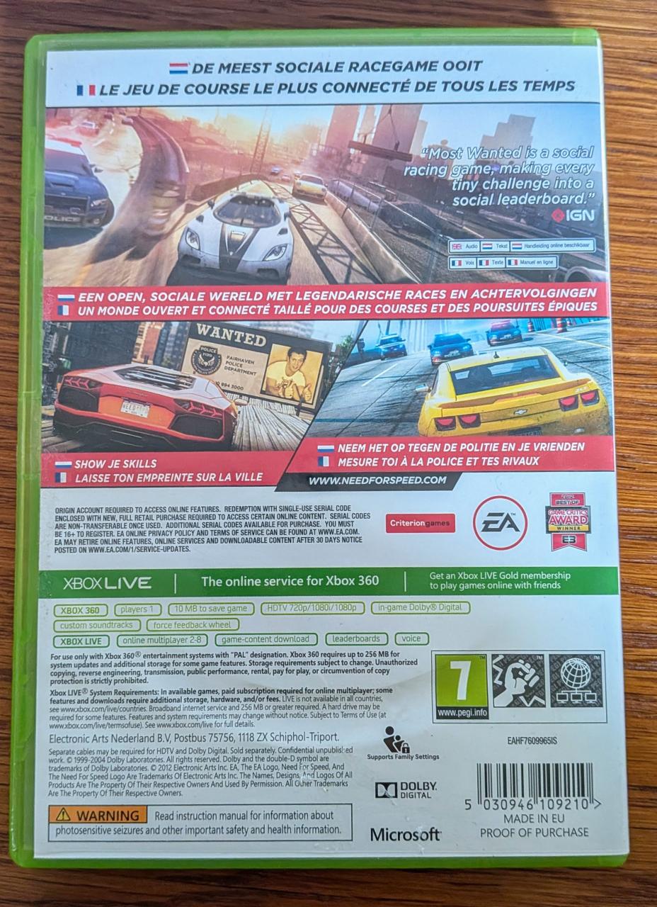 L2 - Need For Speed Most Wanted Xbox 360 - EAN : 5030946109210 - ARTICLE OCCASION EN TRES BON ETAT GÉNÉRAL - BOITIER ORIGINAL XBOX 360 - JEUX JOUABLE EN FRANCAIS - LIVRAISON ULTRA RAPIDE EN COLIS SUIVI PROTÈGE - COVER FR - COMPLET CIB - PRIX FERME ET NON NEGOCIABLE MERCI DE RESPECTER SVP
