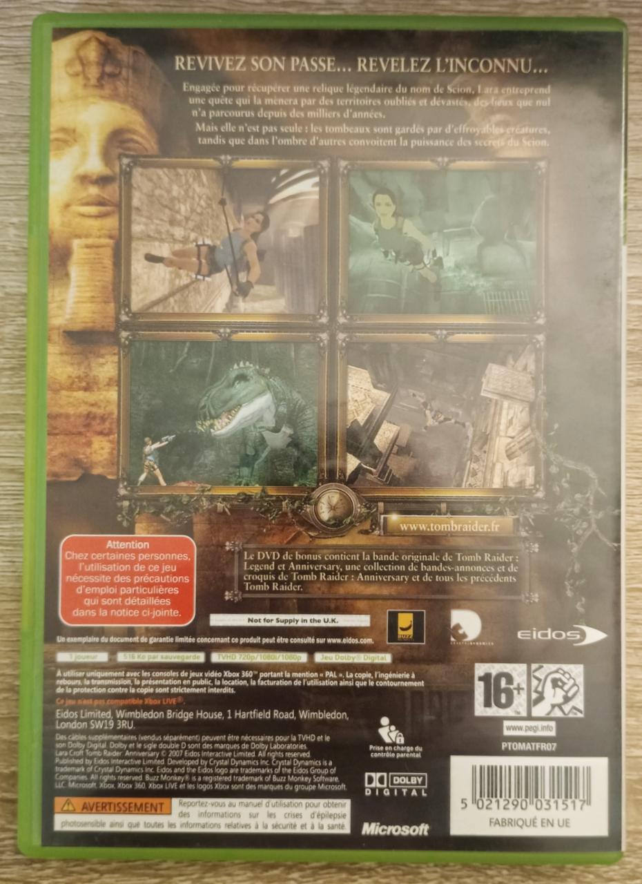L1 - Lara Croft Tomb Raider Anniversary Xbox 360 / EAN : 5021290031517 - ARTICLE OCCASION EN TRES BON ETAT GENERAL - TEST MACHINE OK - PACK COMPLET - LIVRAISON SUPER RAPIDE EN COLIS SUIVI PROTEGE - COVER FR - CIB