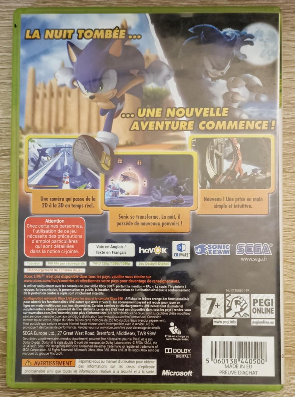 L1 - Sonic Unleashed Xbox 360 / EAN : 5060138440500 - ARTICLE OCCASION EN TRES BON ETAT GENERAL - TEST MACHINE OK - PACK COMPLET - LIVRAISON SUPER RAPIDE EN COLIS SUIVI PROTEGE - COVER FR - COMPLET CIB